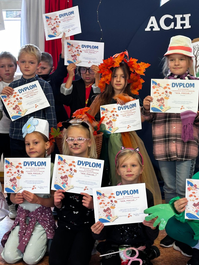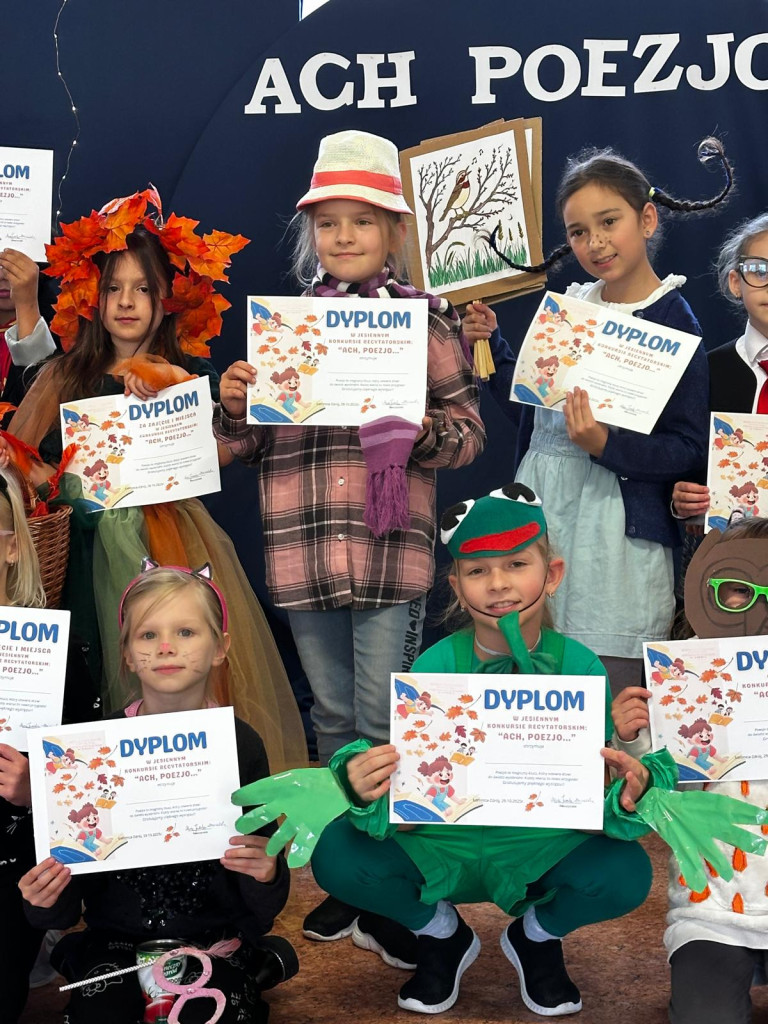 Kreatywna jesień zaprosiła uczniów klas drugich do recytatorskiej rywalizacji pełnej humoru i dobrej zabawy. Na odpowiedź nie trzeba było długo czekać. Dziewczynki i chłopcy podjęli wyzwanie i w pięknej dziecięcej poezji Juliana Tuwima, Jana Brzechwy i Doroty Gellner zaprezentowali się przed przedszkolakami i swoimi rówieśnikami. Barwne, pomysłowe stroje dodały uroku poetyckiemu wydarzeniu, jednak to opanowanie pamięciowe i odpowiednia dykcja zdecydowały o miejscach na podium. Jury wyłoniło dużą grupę zwycięzców. Wszyscy uczestnicy otrzymali dyplomy, nagrody i słodycze, za które serdecznie dziękujemy Radzie Rodziców i p. Ani Toczek. Zapamiętujemy więc humorystyczny konkursowy poranek i układając w głowie własne rymy i rytmy ruszamy w kolejne miesiące nauki.