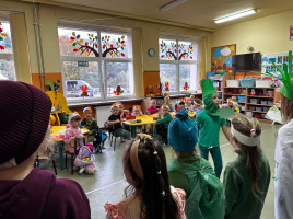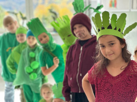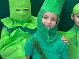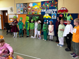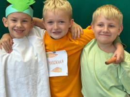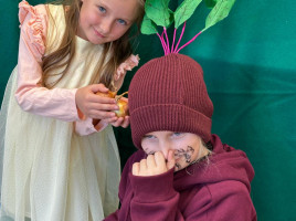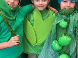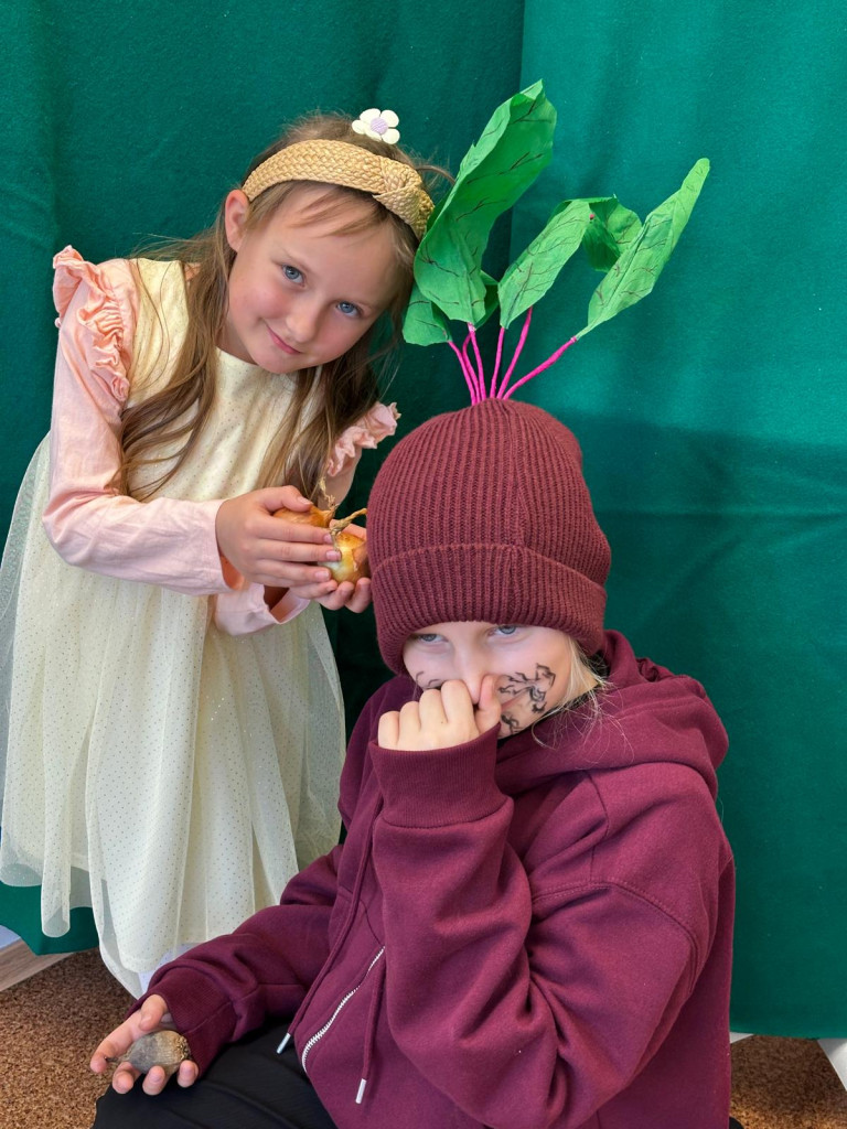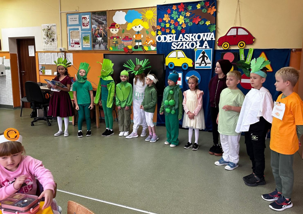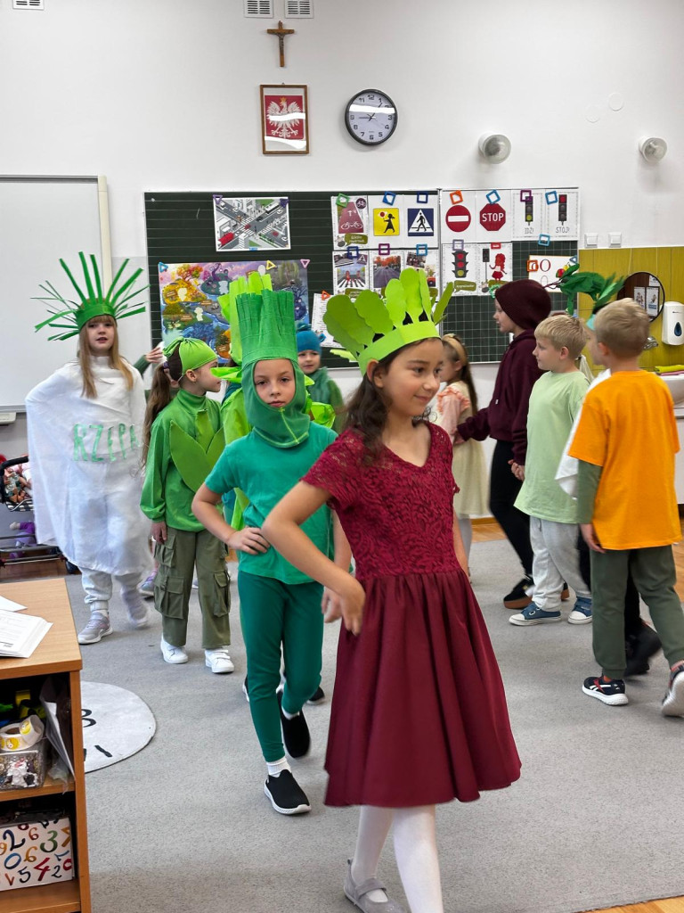 Dziewczynki i chłopcy wcielili się w odpowiednio dobrane role. Krzykliwy szczypiorek dowodził wraz z selerem i pietruszką. Czerwony burak dumnie gardził uczuciami wyciskającej łzy - cebuli, a groch z rzepą w dobrej komitywie szczęśliwie dotarli do finału opowieści. Cóż z tego, przecież według zamysłu autora: Jana Brzechwy, wszystkie warzywa giną w zupie. Najwięcej do powiedzenia ma jednak kapusta - głowa pusta, wyniosła i przemądrzała, która na życiowym straganie nagradzana zostaje brawami! Występom towarzyszył radosny nastrój. Cieszyli się zarówno aktorzy, jak również widzowie - przedszkolaki, których kreatywni drugoklasiści odwiedzili z teatrzykiem. Piękne stroje dodały uroku występom, a one z pewnością pozostaną długo w pamięci małych aktorów.