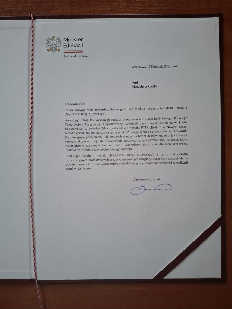 17 listopada w Warszawie odbyło się uroczyste wręczenie medali "NAUCZYCIEL KRAJU OJCZYSTEGO". Ministerstwo Edukacji Narodowej oraz Polskie Towarzystwo Turystyczno-Krajoznawcze (PTTK) kontynuują wieloletnią tradycję uhonorowania osób szczególnie zasłużonych w popularyzacji turystyki i krajoznawstwa wśród dzieci i młodzieży.