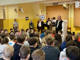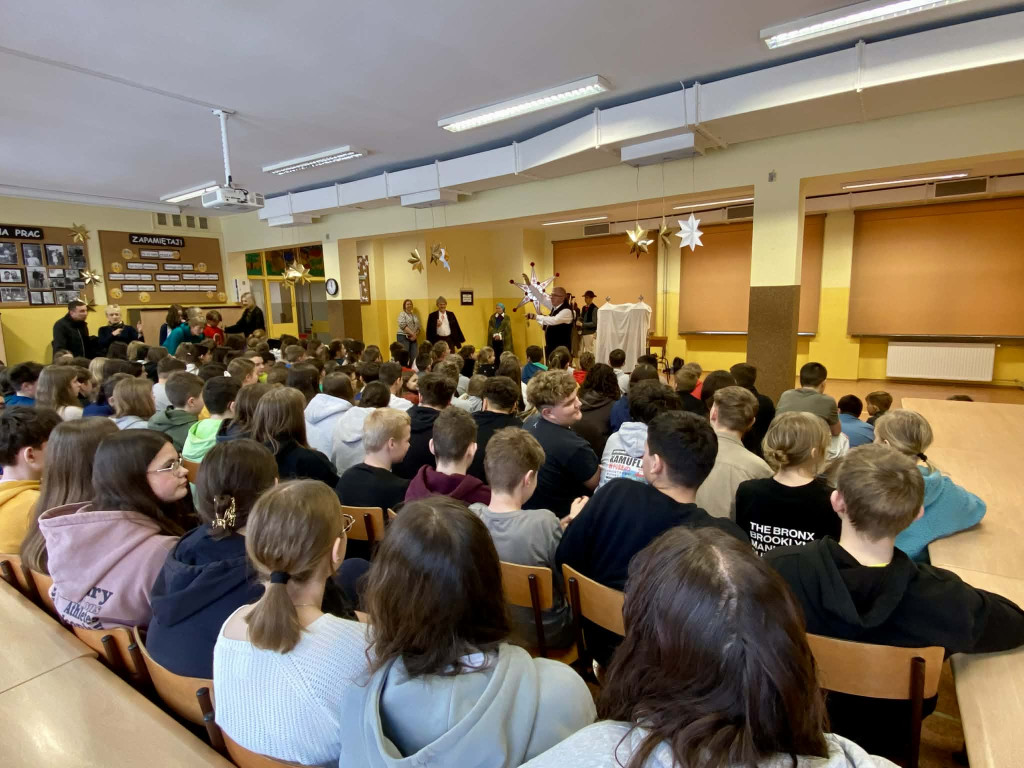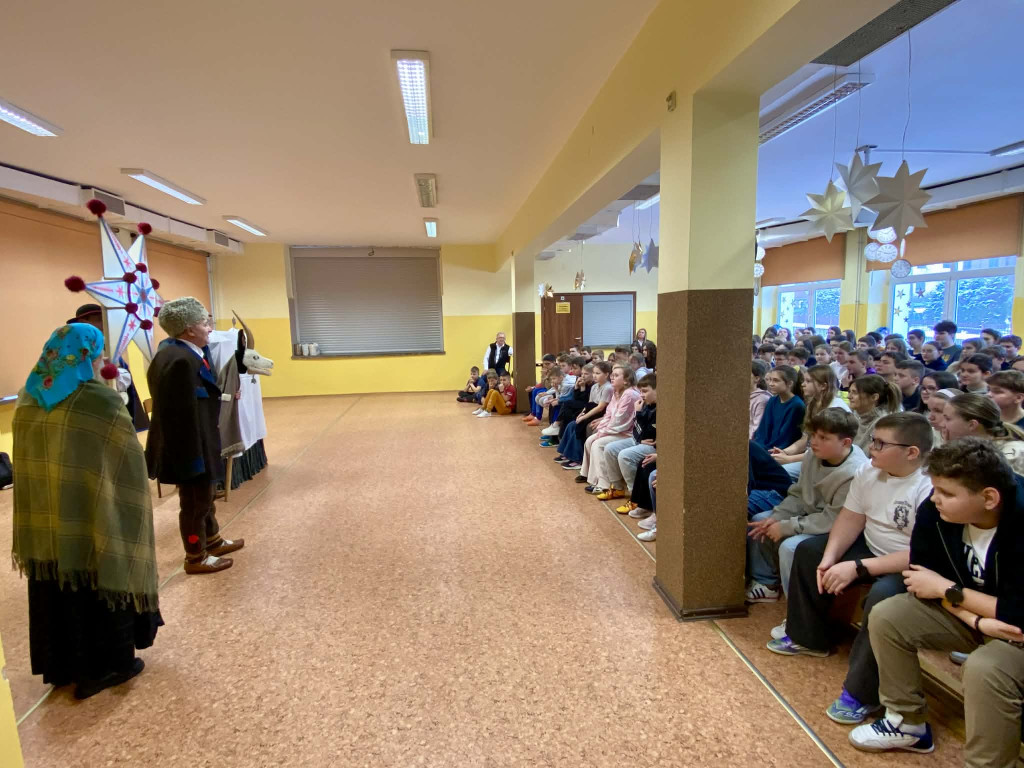 W dniu 29 stycznia w naszej szkole odbyło się spotkanie z przedstawicielami zespołu Dolina Popradu, wraz z panią poetką oraz reżyserką występu panią Wandą Łomnicką – Dulak. Było to wyjątkowe widowisko kolędnicze zatytułowane „ Dobry gospodorzu, wpuś nos na pałace” – inspirowane dawnym kolędowaniem Czarnych Górali z okolic Piwnicznej – Zdroju. Uczniowie naszej szkoły oraz nauczyciele mieli okazję poznać, bądź przypomnieć sobie historię tradycyjnego wejścia kolędników do domu, wędrowania z gwiazdą oraz kozą. Członkowie zespołu w składzie Andrzej Tomasiak, Piotr Śmigowski oraz Stanisław Jarząb pokazali uczniom tradycyjną szopkę kolędniczą oraz ręcznie robione figurki do szopki wykonane przez Jana Tomasiaka. Za sprawą tego spotkania przenieśliśmy się w świat góralskich obrzędów, tradycyjnych melodii i świątecznej wspólnoty, wykonując wspólnie z grupą kolędniczą nasze regionalne kolędy i pastorałki.