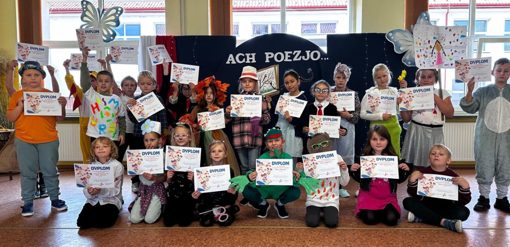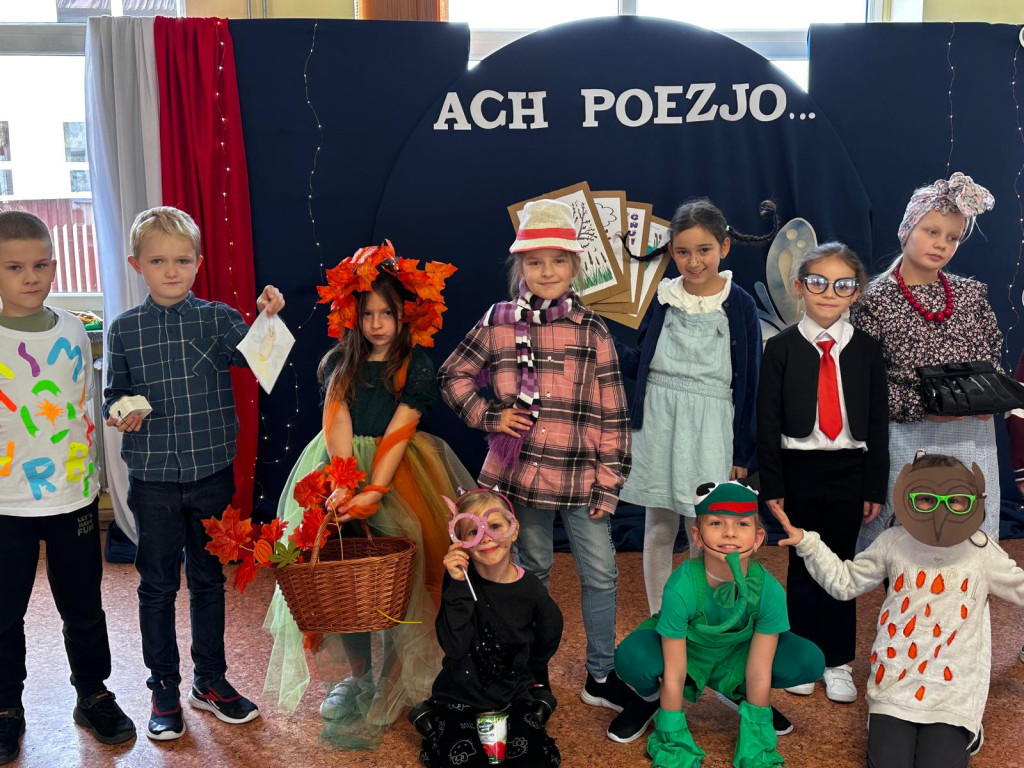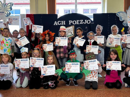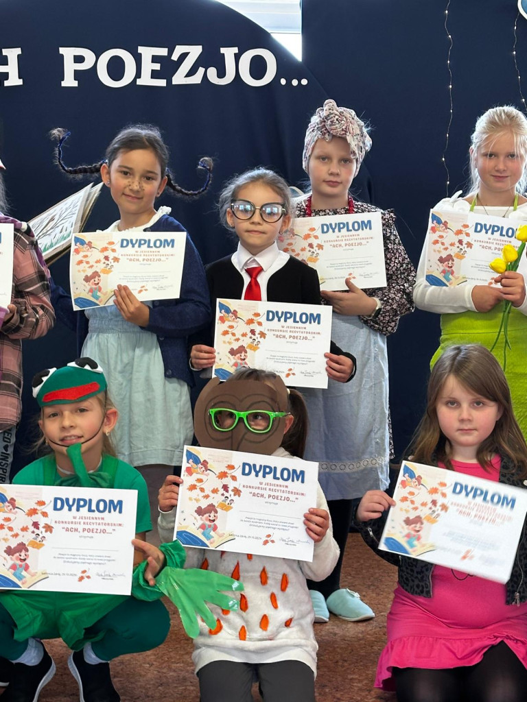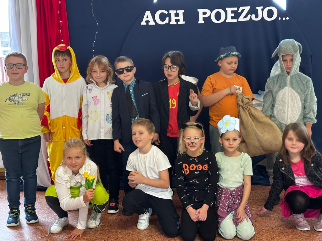 Kreatywna jesień zaprosiła uczniów klas drugich do recytatorskiej rywalizacji pełnej humoru i dobrej zabawy. Na odpowiedź nie trzeba było długo czekać. Dziewczynki i chłopcy podjęli wyzwanie i w pięknej dziecięcej poezji Juliana Tuwima, Jana Brzechwy i Doroty Gellner zaprezentowali się przed przedszkolakami i swoimi rówieśnikami. Barwne, pomysłowe stroje dodały uroku poetyckiemu wydarzeniu, jednak to opanowanie pamięciowe i odpowiednia dykcja zdecydowały o miejscach na podium. Jury wyłoniło dużą grupę zwycięzców. Wszyscy uczestnicy otrzymali dyplomy, nagrody i słodycze, za które serdecznie dziękujemy Radzie Rodziców i p. Ani Toczek. Zapamiętujemy więc humorystyczny konkursowy poranek i układając w głowie własne rymy i rytmy ruszamy w kolejne miesiące nauki.