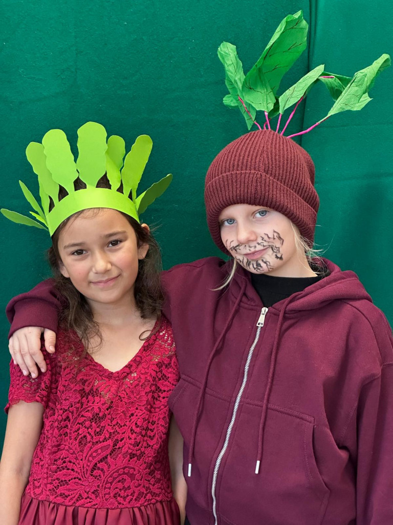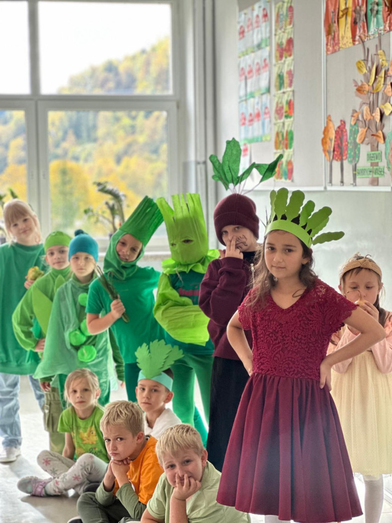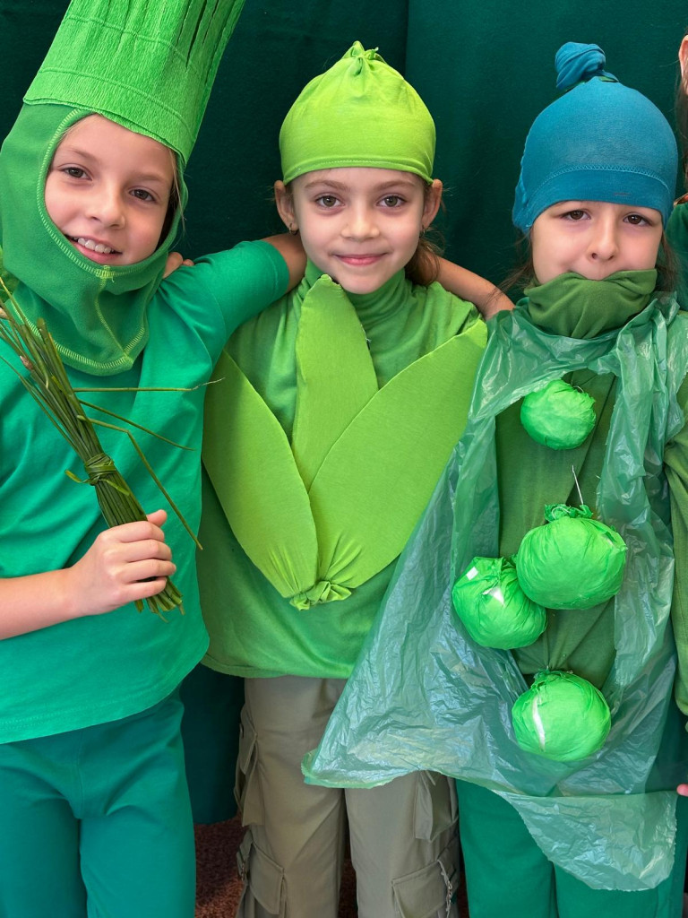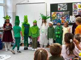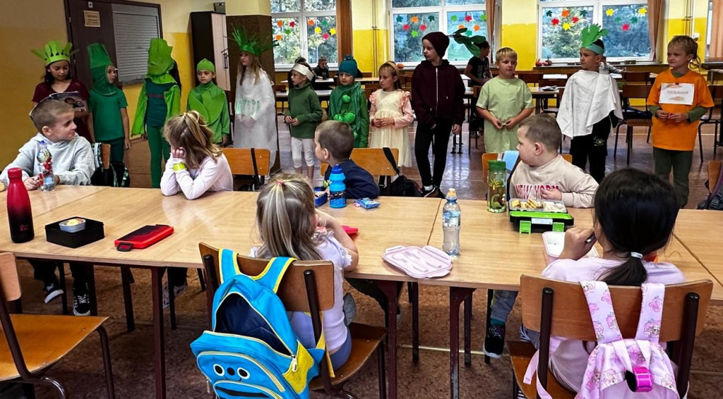 Dziewczynki i chłopcy wcielili się w odpowiednio dobrane role. Krzykliwy szczypiorek dowodził wraz z selerem i pietruszką. Czerwony burak dumnie gardził uczuciami wyciskającej łzy - cebuli, a groch z rzepą w dobrej komitywie szczęśliwie dotarli do finału opowieści. Cóż z tego, przecież według zamysłu autora: Jana Brzechwy, wszystkie warzywa giną w zupie. Najwięcej do powiedzenia ma jednak kapusta - głowa pusta, wyniosła i przemądrzała, która na życiowym straganie nagradzana zostaje brawami! Występom towarzyszył radosny nastrój. Cieszyli się zarówno aktorzy, jak również widzowie - przedszkolaki, których kreatywni drugoklasiści odwiedzili z teatrzykiem. Piękne stroje dodały uroku występom, a one z pewnością pozostaną długo w pamięci małych aktorów.