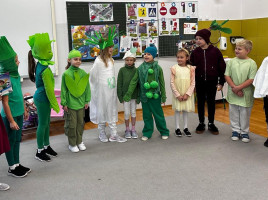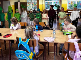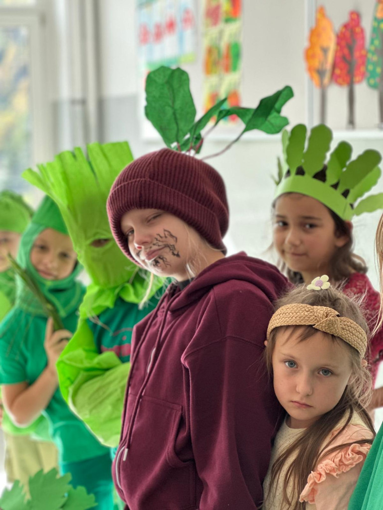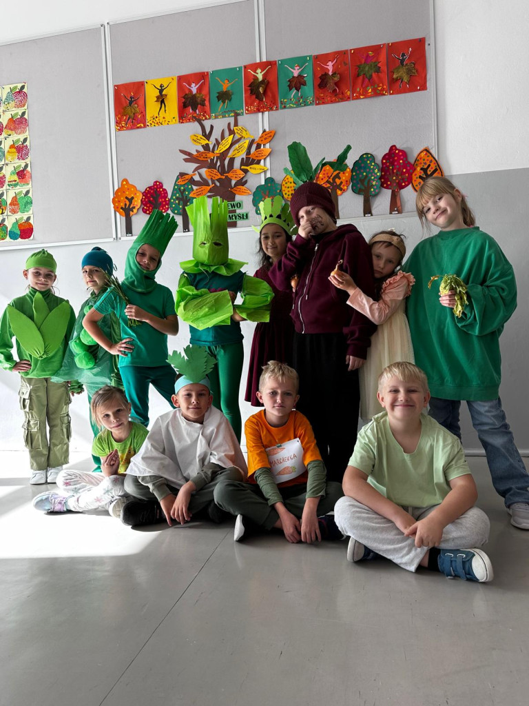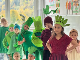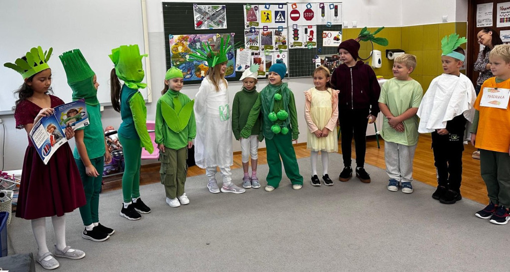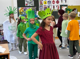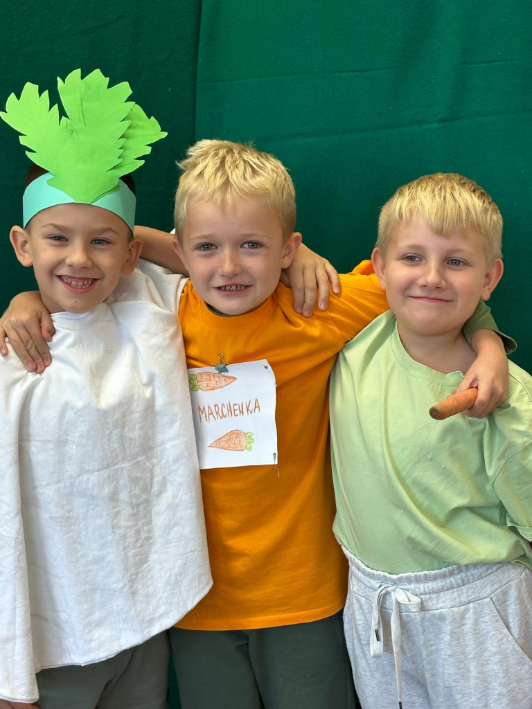 Dziewczynki i chłopcy wcielili się w odpowiednio dobrane role. Krzykliwy szczypiorek dowodził wraz z selerem i pietruszką. Czerwony burak dumnie gardził uczuciami wyciskającej łzy - cebuli, a groch z rzepą w dobrej komitywie szczęśliwie dotarli do finału opowieści. Cóż z tego, przecież według zamysłu autora: Jana Brzechwy, wszystkie warzywa giną w zupie. Najwięcej do powiedzenia ma jednak kapusta - głowa pusta, wyniosła i przemądrzała, która na życiowym straganie, wcielając się w rolę smutnego warzywa, za swój morał nagradzana zostaje brawami! Występom towarzyszył radosny nastrój. Cieszyli się zarówno aktorzy, jak również widzowie - przedszkolaki, których kreatywni drugoklasiści odwiedzili z teatrzykiem. Piękne stroje dodały uroku występom, a one z pewnością pozostaną długo w pamięci nie tylko małych artystów.