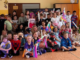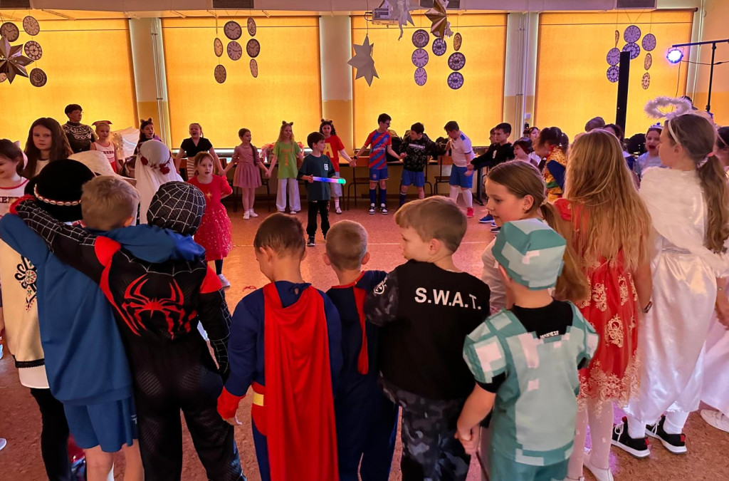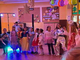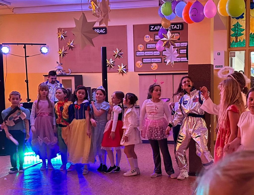 Styczniowe przedpołudnie w dniu 16. stycznia 2026 roku zaprosiło do wspólnej zabawy wszystkie grupy przedszkolaków i uczniów klas początkowych. Dynamiczna muzyka, żywe barwy świateł i wspaniałe towarzystwo stworzyły klimat serdecznej zabawy. Zespół prowadzący imprezę powiódł uczestników kosmicznym szlakiem muzycznych rytmów. Nie brakło elementów tanecznej rywalizacji, intrygujących zgadywanek, a nade wszystko wspólnej dziecięcej radości. Zachwycały piękne, niebanalne stroje dziewczynek i chłopców. Po szalonych rozrywkach poczęstunek smakował wyśmienicie. Dziękujemy Rodzicom za zaangażowanie i obecność. Niech minione chwile wybrzmiewają jeszcze w naszej pamięci póki Karnawał trwa!
