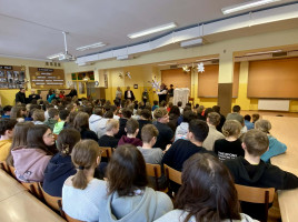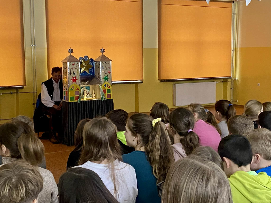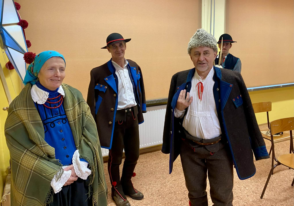 W dniu 29 stycznia w naszej szkole odbyło się spotkanie z przedstawicielami zespołu Dolina Popradu, wraz z panią poetką oraz reżyserką występu panią Wandą Łomnicką – Dulak. Było to wyjątkowe widowisko kolędnicze zatytułowane „ Dobry gospodorzu, wpuś nos na pałace” – inspirowane dawnym kolędowaniem Czarnych Górali z okolic Piwnicznej – Zdroju. Uczniowie naszej szkoły oraz nauczyciele mieli okazję poznać, bądź przypomnieć sobie historię tradycyjnego wejścia kolędników do domu, wędrowania z gwiazdą oraz kozą. Członkowie zespołu w składzie Andrzej Tomasiak, Piotr Śmigowski oraz Stanisław Jarząb pokazali uczniom tradycyjną szopkę kolędniczą oraz ręcznie robione figurki do szopki wykonane przez Jana Tomasiaka. Za sprawą tego spotkania przenieśliśmy się w świat góralskich obrzędów, tradycyjnych melodii i świątecznej wspólnoty, wykonując wspólnie z grupą kolędniczą nasze regionalne kolędy i pastorałki.