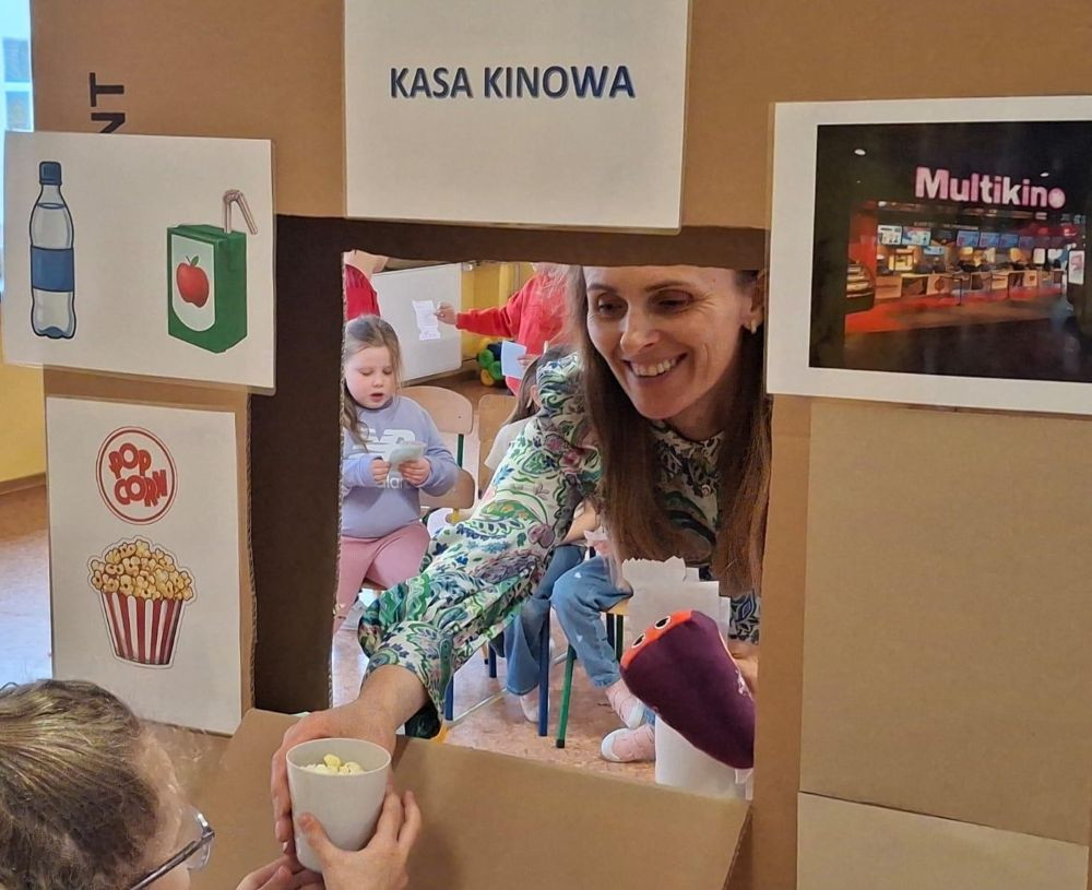 Program ten łączył zabawę, elementy logopedii oraz działania plastyczne, wspierając rozwój językowy, emocjonalny. Dzieci dowiedziały się jak należy się zachowywać w kinie. Jak wyposażone jest kino. Wykonaliśmy projektory, bilety do kina. W kasie kinowej przedszkolaki mogły zakupić: bilety na bajkę "Blue", popcorn, soczek. Wszyscy bawili się świetnie.