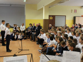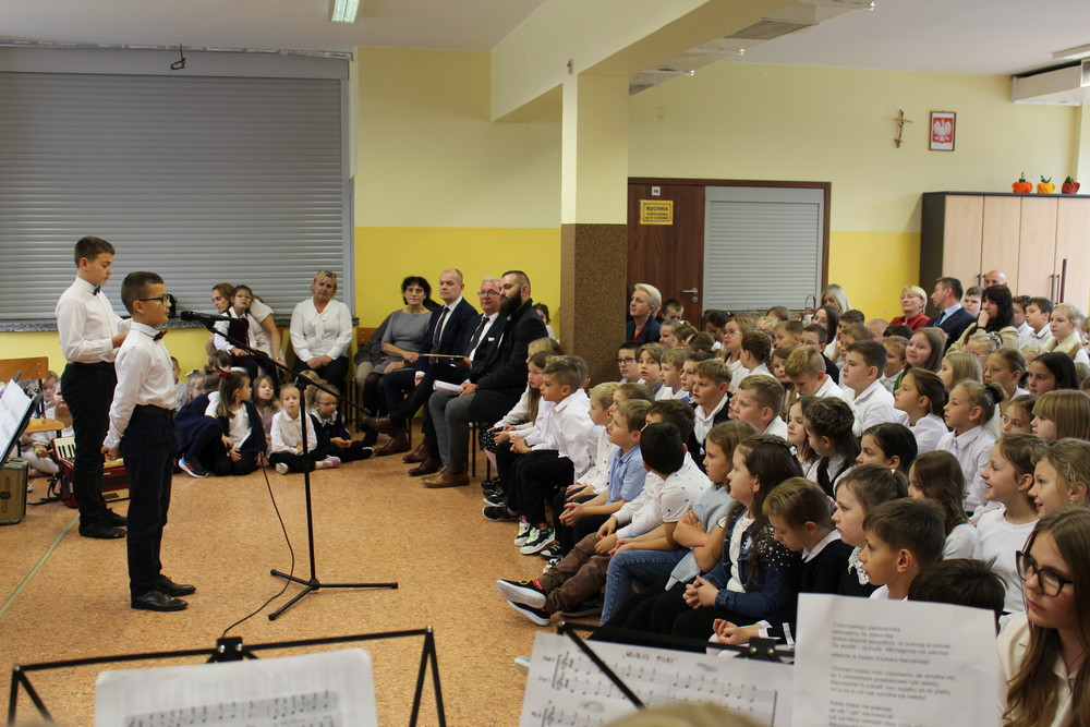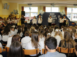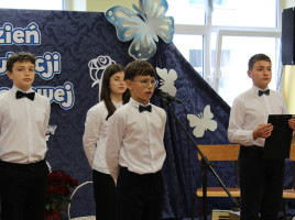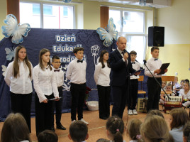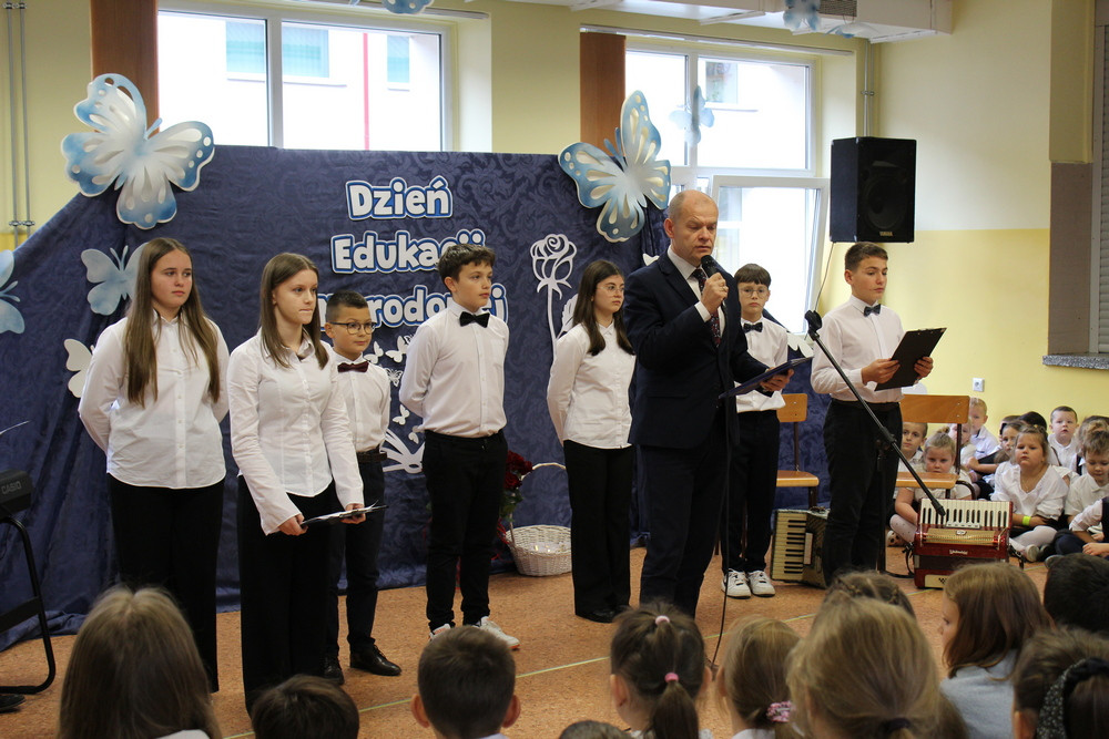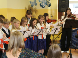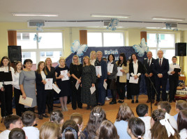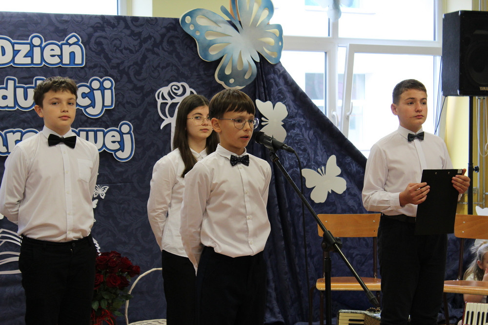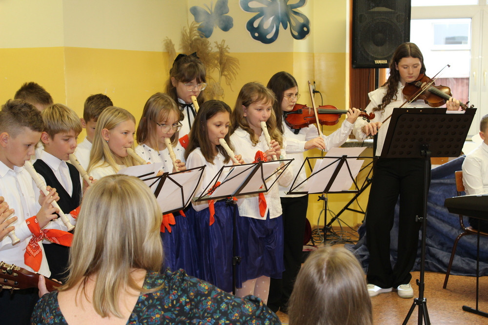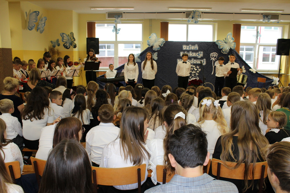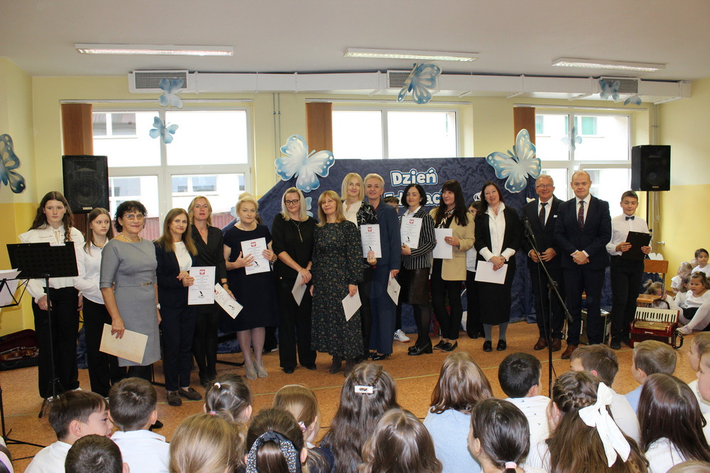 Na scenie zaprezentowali się utalentowani uczniowie z klasy 4a i 6b, którzy przygotowali wspaniały występ artystyczny. Uczniowie klasy 4a zachwycili publiczność pokazem gry na fletach, natomiast młodzi muzycy z klasy 6b zaprezentowali swoje umiejętności gry na akordeonie, skrzypcach i keyboardzie. W czasie uroczystości wręczono nagrody dla wyróżnionych nauczycieli, w podziękowaniu za ich codzienny trud, pasję i zaangażowanie w wychowanie młodego pokolenia. Akademia przebiegła w ciepłej, serdecznej atmosferze, pełnej muzyki, uśmiechów i życzeń. Wszystkim nauczycielom życzymy wielu sukcesów zawodowych, oraz satysfakcji z codziennej pracy i nieustającej radości z kontaktu z uczniami.