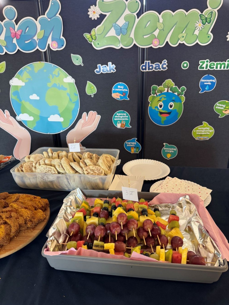 Tego dnia na szkolnym korytarzu nie zabrakło kolorowego stoiska z owocami, warzywami oraz zdrowymi przekąskami. Uczniowie mogli spróbować m.in. szaszłyków z owoców, placków pasterskich oraz pełnoziarnistych kanapek. Wszystkie potrawy zostały przygotowane z dbałością o wartości odżywcze i estetykę podania.