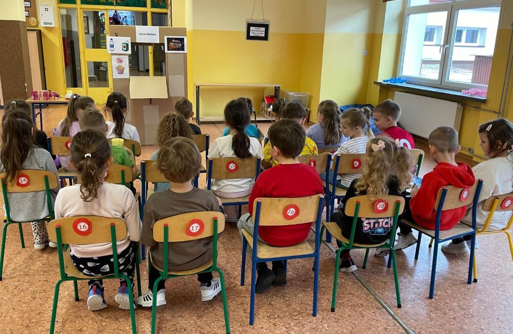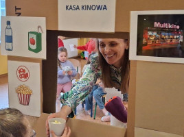 Program ten łączył zabawę, elementy logopedii oraz działania plastyczne, wspierając rozwój językowy, emocjonalny. Dzieci dowiedziały się jak należy się zachowywać w kinie. Jak wyposażone jest kino. Wykonaliśmy projektory, bilety do kina. W kasie kinowej przedszkolaki mogły zakupić: bilety na bajkę "Blue", popcorn, soczek. Wszyscy bawili się świetnie.