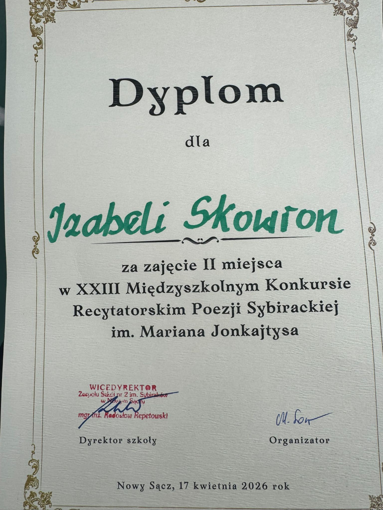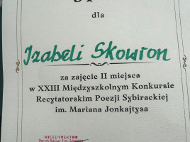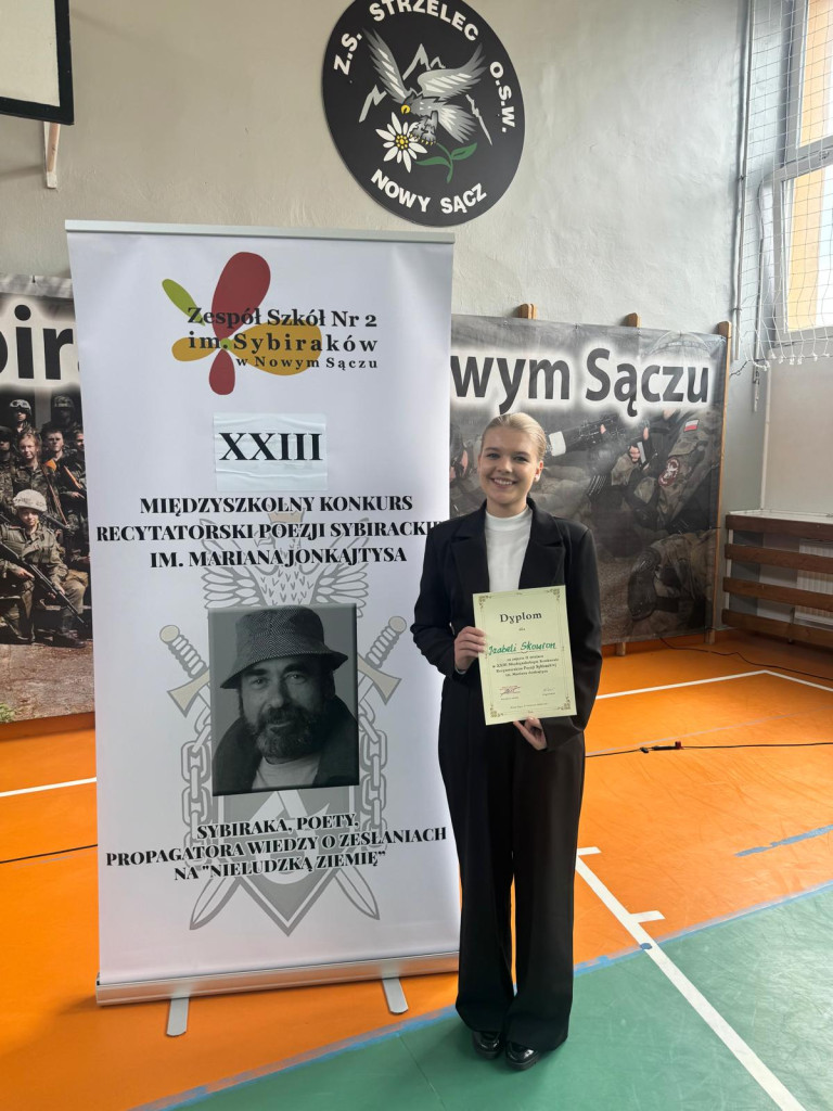 Izabela Skowron odniosła znaczący sukces, zajmując II miejsce w XIII Międzyszkolnym Konkursie Recytatorskim Poezji Sybirackiej w Nowym Sączu. To wyjątkowe osiągnięcie zasługuje na szczególne uznanie, zwłaszcza że poezja sybiracka porusza niezwykle trudne i głęboko emocjonalne tematy związane z historią zesłań i ludzkiego cierpienia.